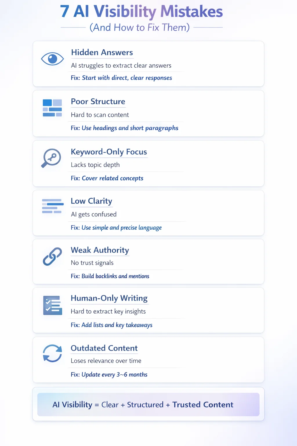 AI visibility mistakes are content or SEO issues that prevent your website from being selected or cited by AI tools. These mistakes often come from outdated SEO habits. Many websites still focus only on keywords and rankings, while AI systems look for clarity, structure, and trust.