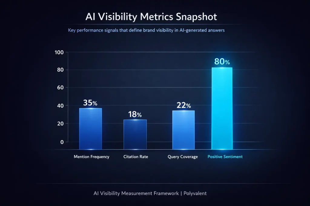 Share of mentions: The percentage of your tracked queries on which your brand appears. A brand with 40% share of mentions across 30 queries is considerably more visible than one at 10%.