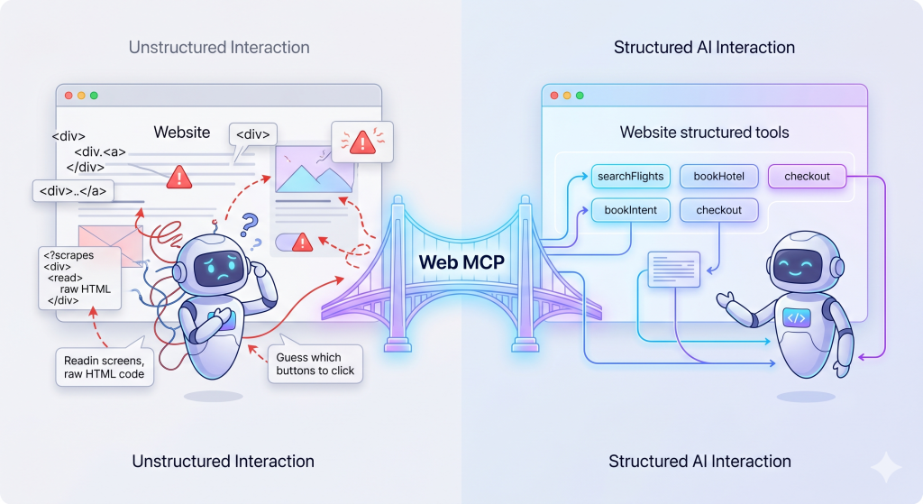 Three persistent failures define the AI-website relationship today. Web MCP addresses all three.